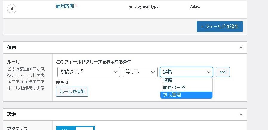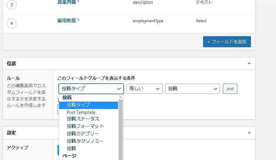 このままだと「投稿」にも「求人管理」にもカスタムフィールドが表示されてしまうので、「求人管理」のみカスタムフィールドが表示されるように設定を変更してみます。Advanced Custom Fieldsの設定画面のフィールドグループの下の方を開きます。
