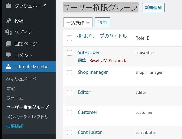 メニューから「ユーザー権限グループ」を開きます。新規登録がSubscriber(購読者)であれば、Subscriberの編集画面に入ります。