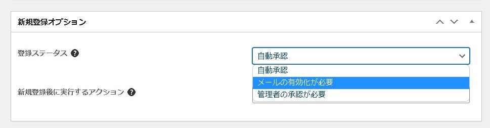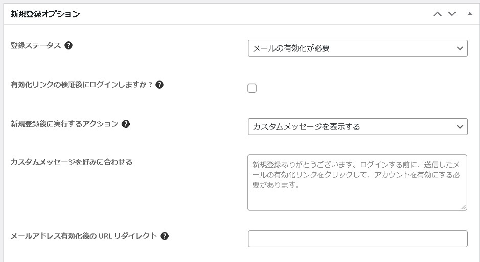 【新規登録後に実行するアクション】ユーザーがサイトに登録した後に実行するアクションを選択します。 ステータスに応じて、プロフィール、カスタムURL、またはカスタムメッセージを表示することができます