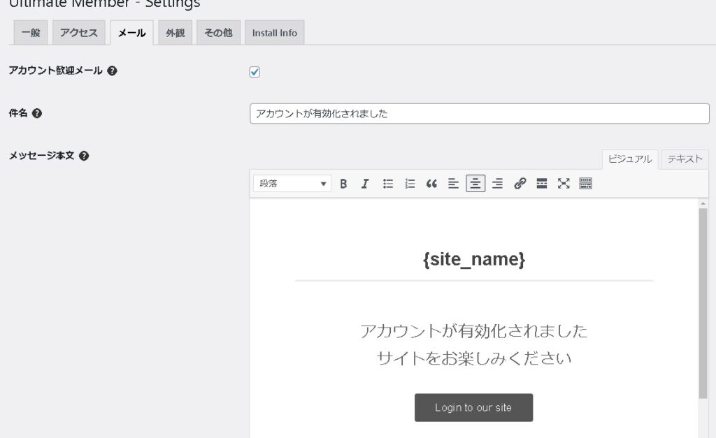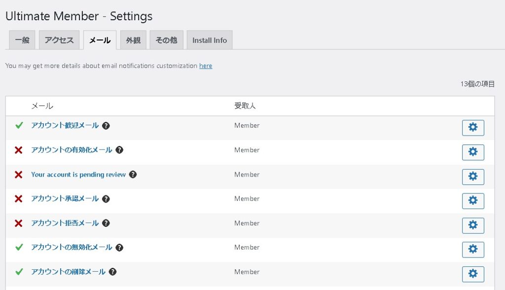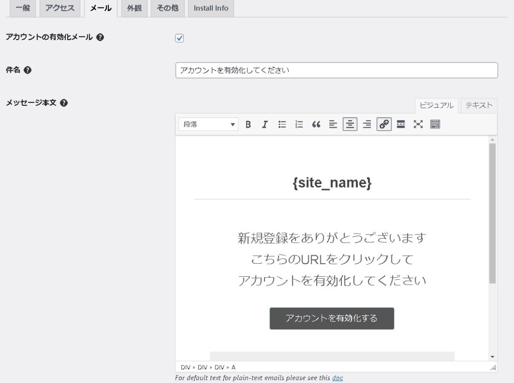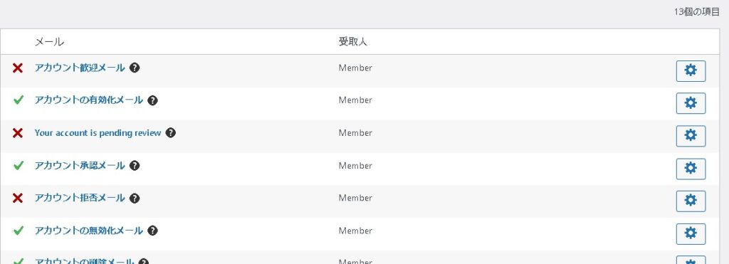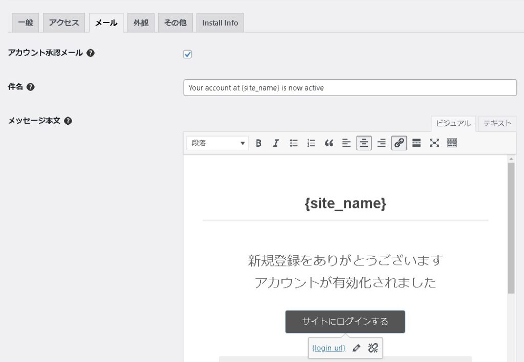 あとは、「アカウント承認」メールも有効化しておきましょう。