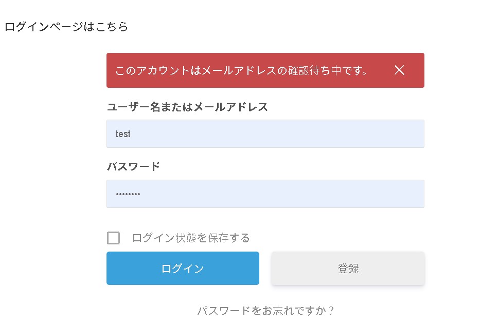 有効化する前にログインしようとしても、「このアカウントはメールアドレスの確認待ち中です。」と表示されてログインできないようになっています。