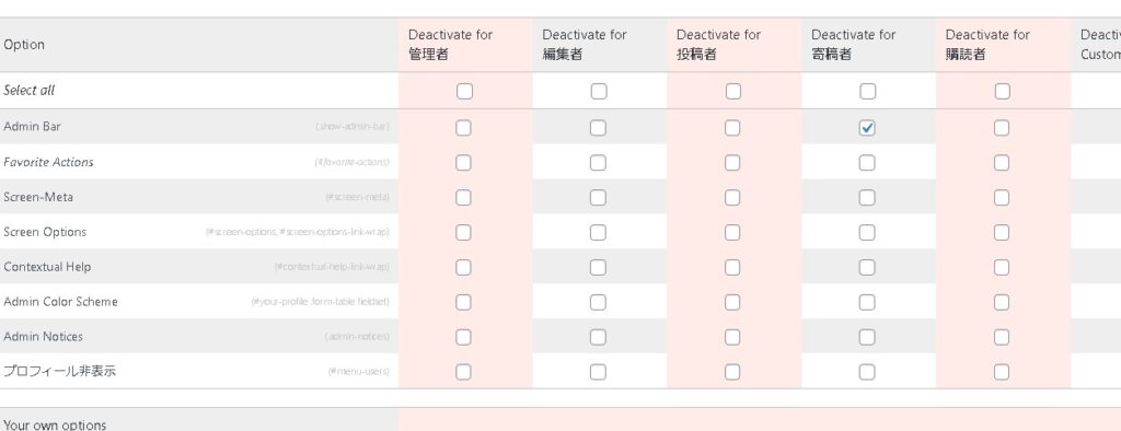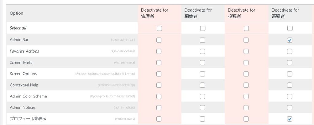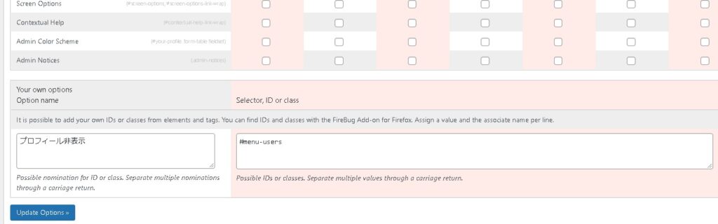 「Your own options Option name」は表示名ですので、「プロフィール非表示」など分かりやすい名称を設定しておき、Selector, ID or classに「#menu-users」を追加してアップデートします。