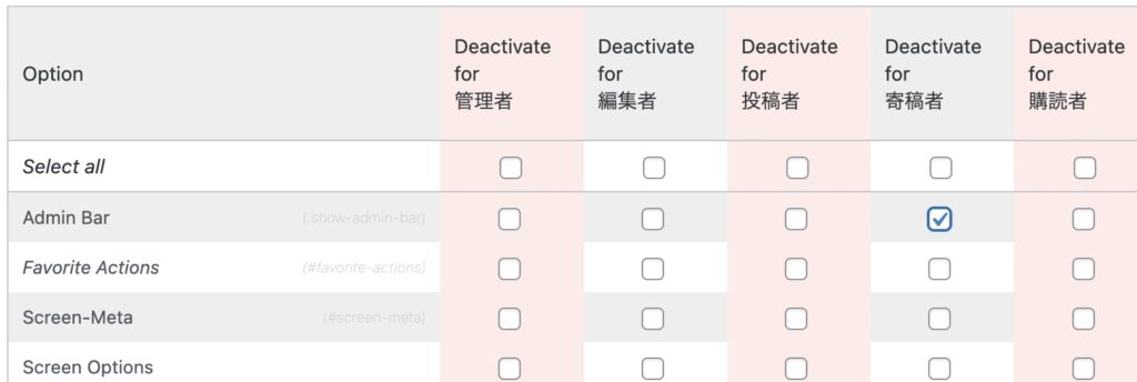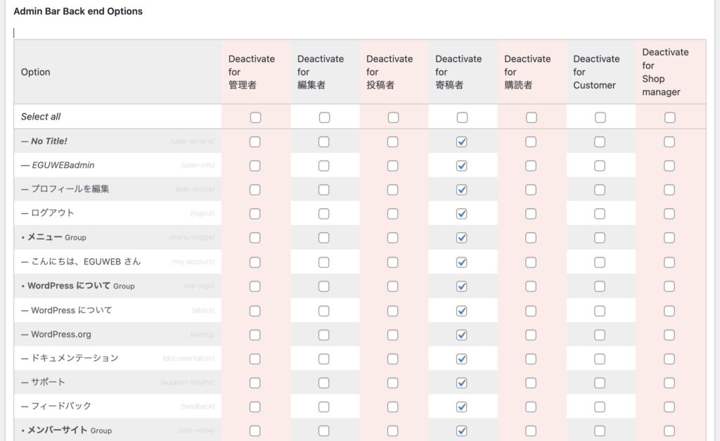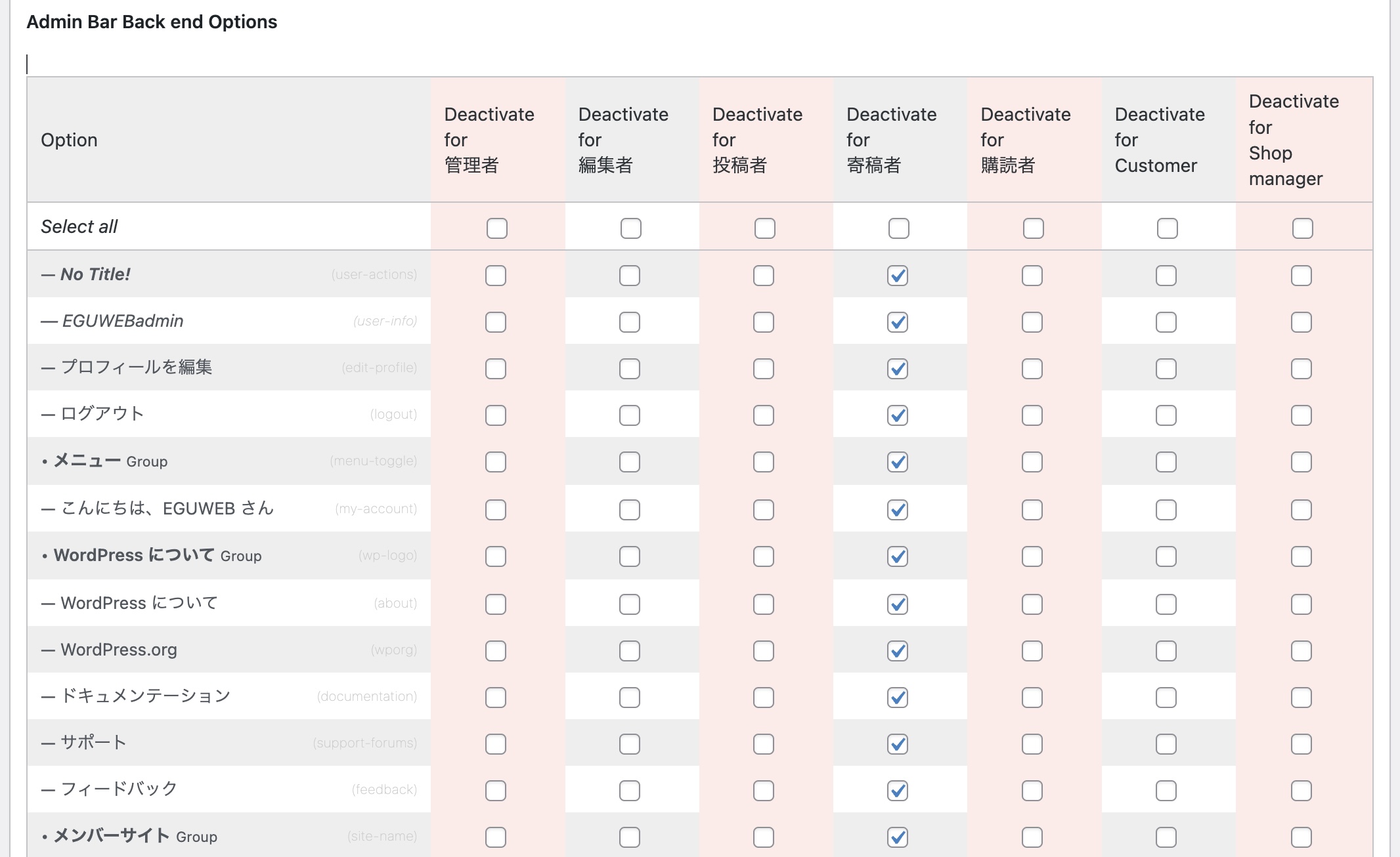 「Global options」の中に「Admin Bar」というチェックがあります。こちらをオンにします。