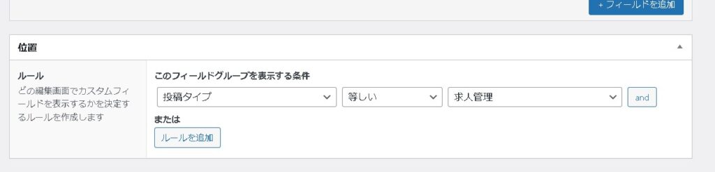 このままだと、カスタムフィールドがカスタム投稿の求人管理に表示されないので、アドバンスドカスタムフィールドの設定を変更します。