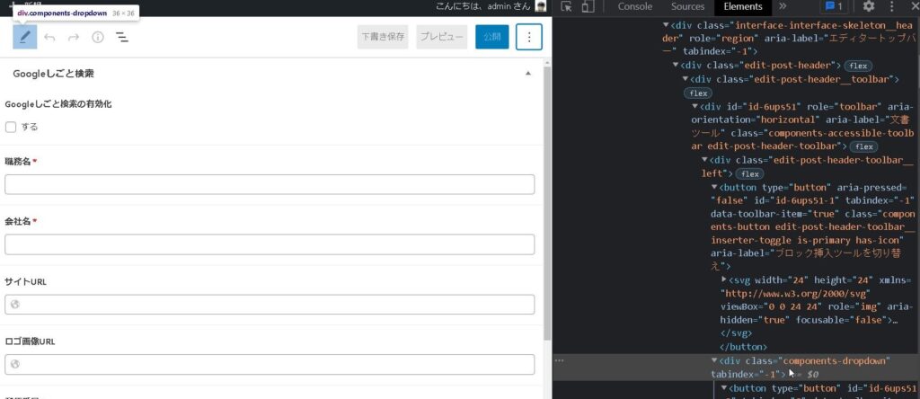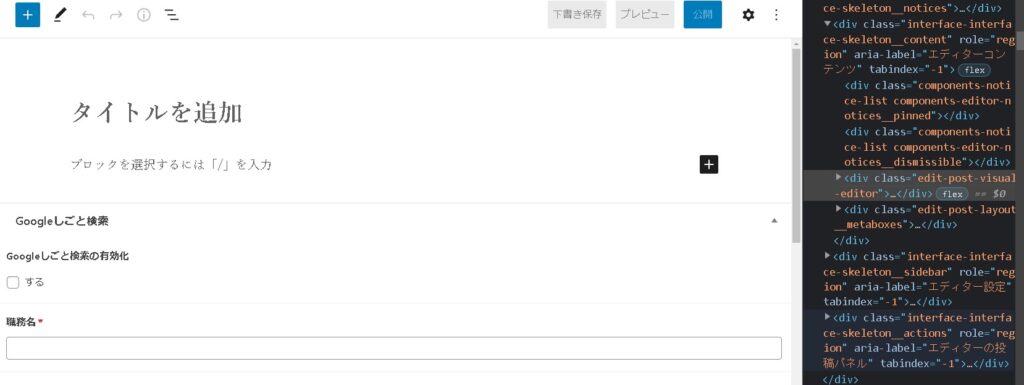 まずは「タイトル」と「コンテンツ」が入力できるエディタの投稿部分を丸ごと非表示にしてみます。デベロッパーツールで見ていくと、下記のクラス部分がエディターの本体部分(と思われる場所)のようです。