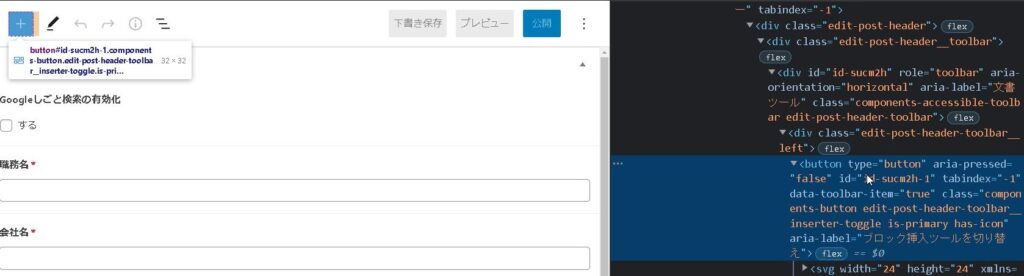 <button type="button" aria-pressed="false" id="id-sucm2h-1" tabindex="-1" data-toolbar-item="true" class="components-button edit-post-header-toolbar__inserter-toggle is-primary has-icon" aria-label="ブロック挿入ツールを切り替え">