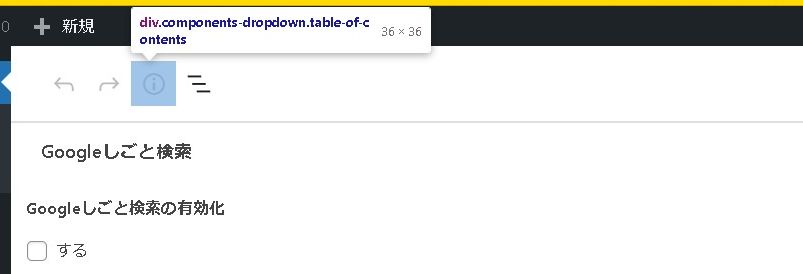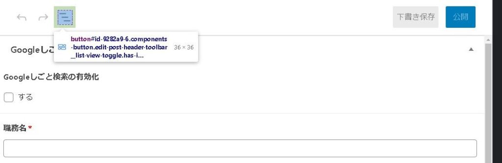 <button type="button" aria-pressed="false" id="id-9282a9-6" tabindex="0" data-toolbar-item="true" class="components-button edit-post-header-toolbar__list-view-toggle has-icon" aria-label="リスト表示">