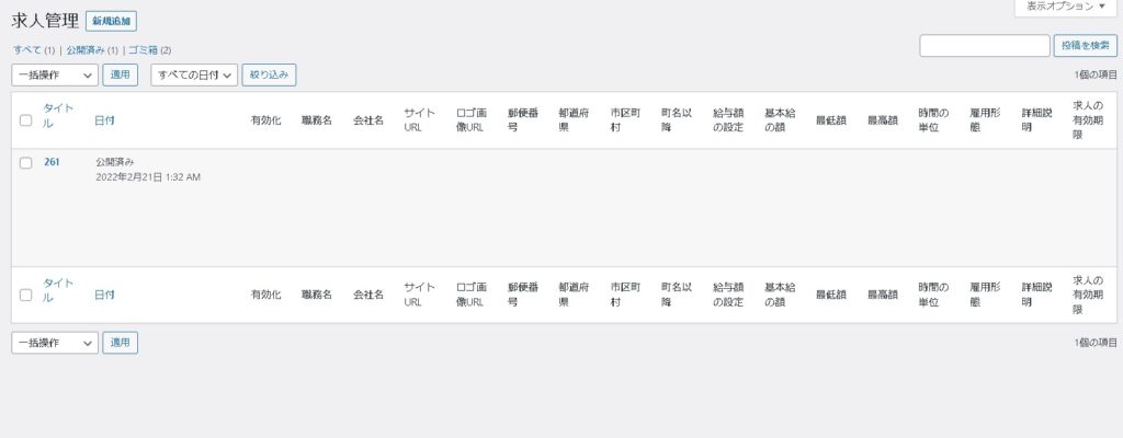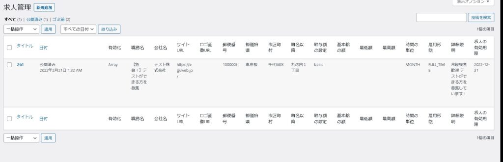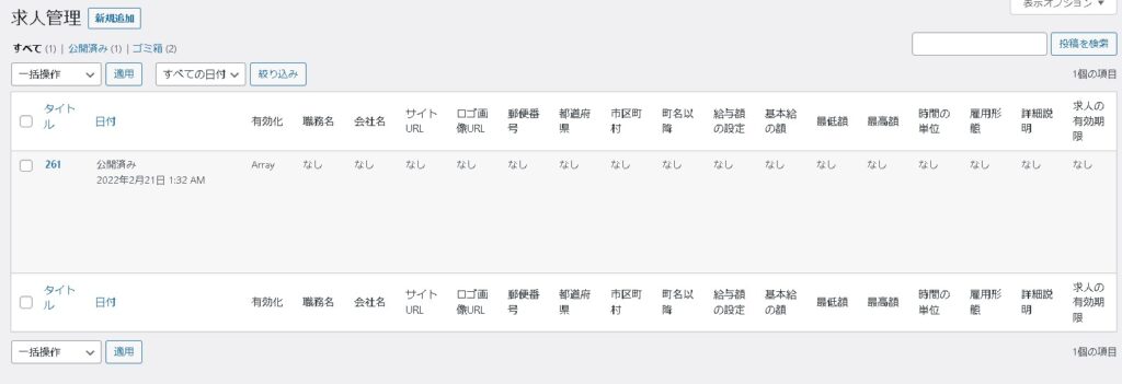 これで、求人管理一覧に登録されている内容を出力させることができるようになりました。この記事のテーマもずいぶん長くなってきましたが、まだ先に続きそうな予感ですので、また次回に続きます。ご参考ください😃