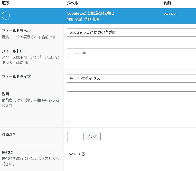 チェックボックスのところが「Array」になってしまっていますが、後で考えるとして、ひとまず全ての値が表示されるように変更してみます。あと「なし」が出ると表示が分かりにくい気もしてきましたので、非表示にしておきます。