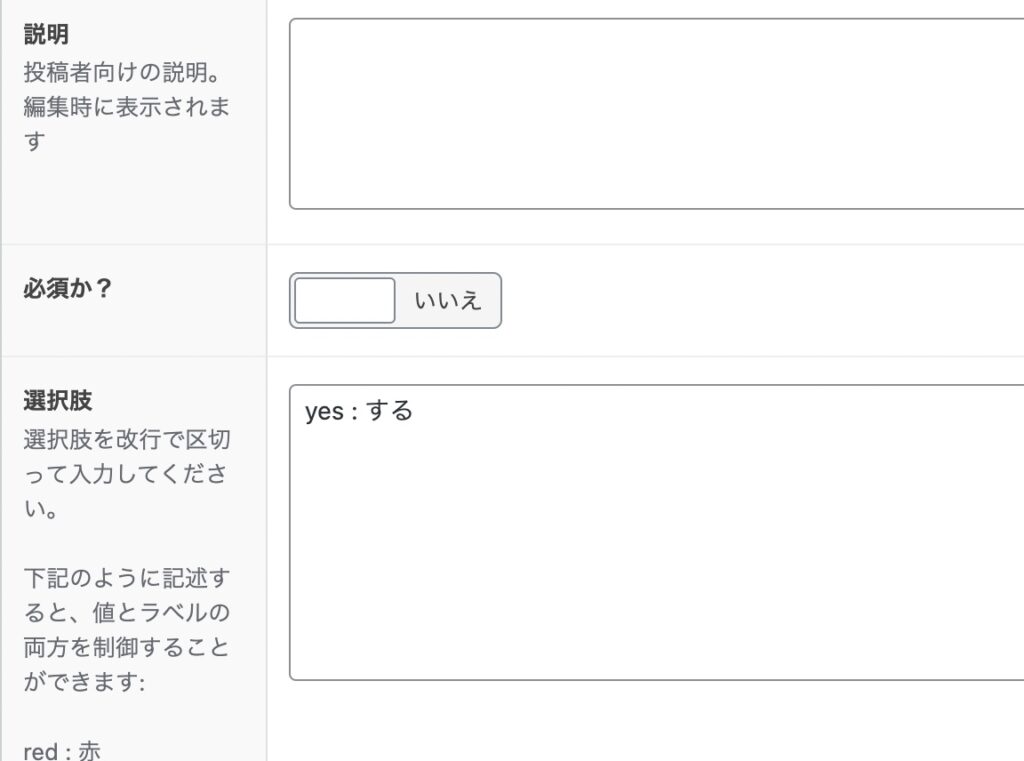 そういえば…カスタムフィールドの選択肢で「yes:する」としていました。つまり、結果として「値」の方を取得していることになります。