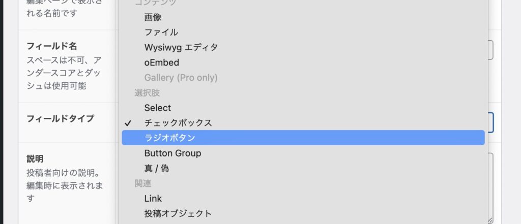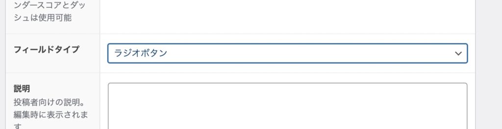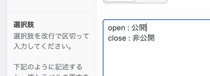 ここで思いきって、選択を「ラジオボタン」に変更してみます。詳しくは別記事「ACFの選択肢の値を抽出する」の記事でまとめたいと思いますが、今回の要件だと、よくよく考えれば、セレクトボックスか「ラジオボタン」あたりが使いやすそうに思われます。「有効化」「非公開」というラジオボタンに変更してみます。