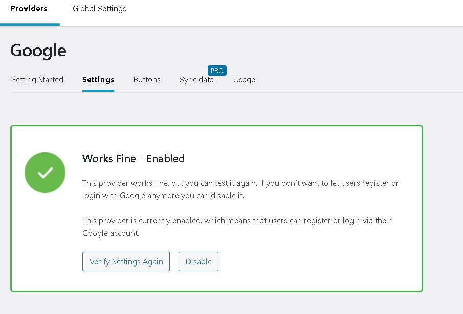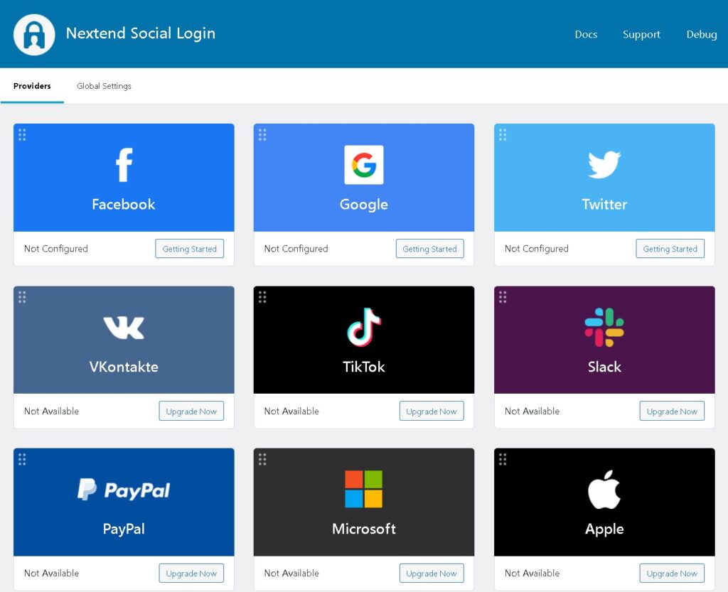 プラグインを有効化すると、Social Loginのメニューが追加されます!Upgrade NowはPRO(有料)アカウントのみのようですが、無料の範囲でも「Facebook」「Google」「Twitter」が使えるようになっています。