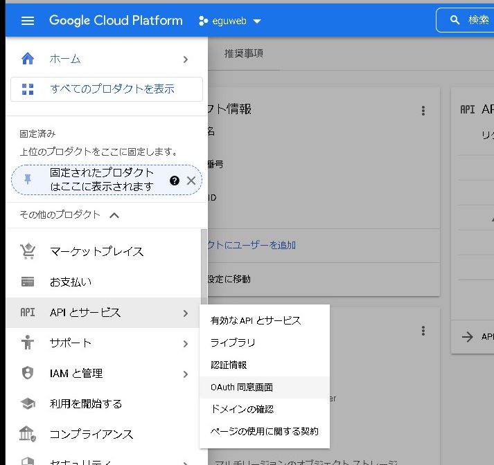 プロジェクトの中から「OAuth同意画面」を選択します。