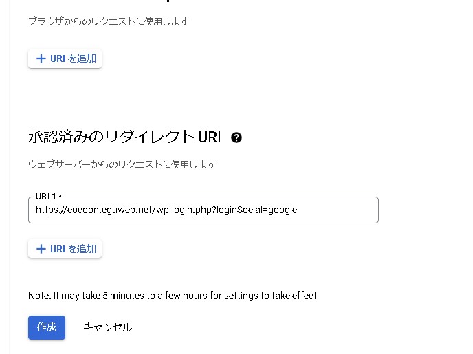 プラグインの設定の中に「Under the “Authorised redirect URIs” section click “Add URI” and add the following URL:」の下にリダイレクトURIが表示されているので、こちらを先程のOAuth クライアント ID の作成画面に設定します。