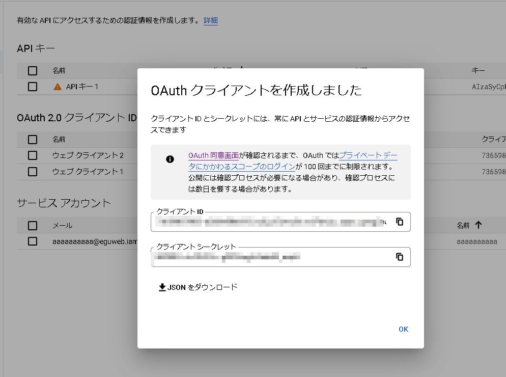 作成を押すと、「OAuth クライアントを作成しました」と表示されて、「クライアント ID」「クライアント シークレット」をそれぞれコピーしておきます。