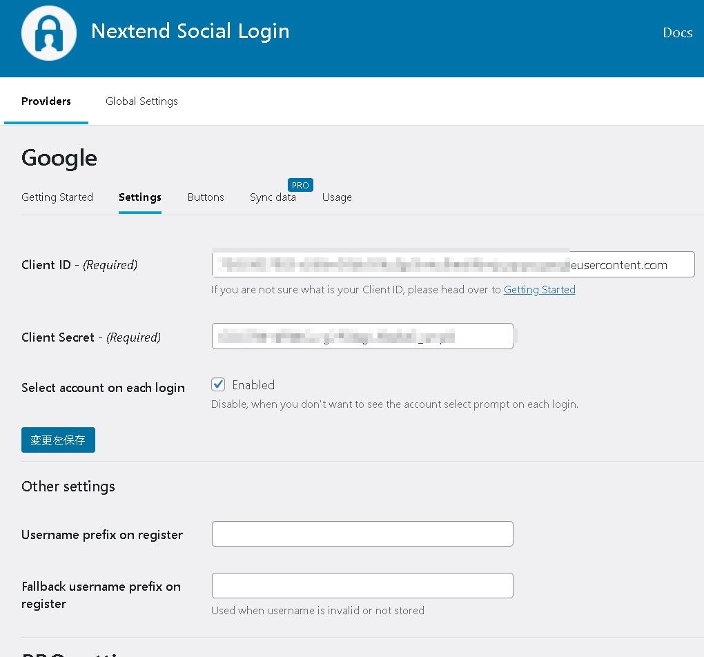 Client ID – (Required)・Client Secret – (Required)に、それぞれ先程コピーした内容を貼り付けします。