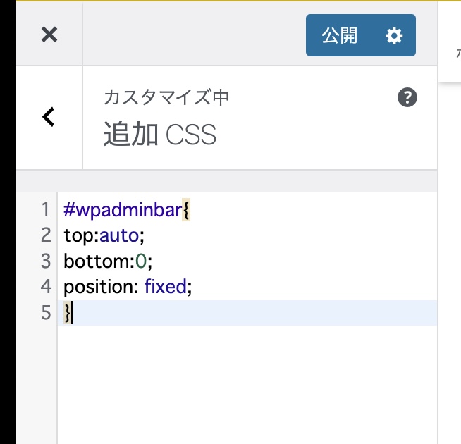 下記のCSSを追加CSSに追加すると、管理バー(adminbar)をページの下部に表示移動できます。positionの位置を変えている感じですね。
