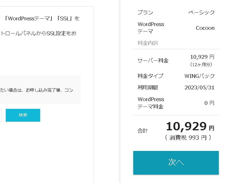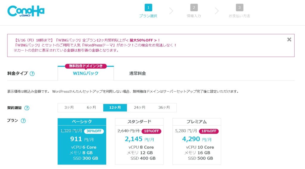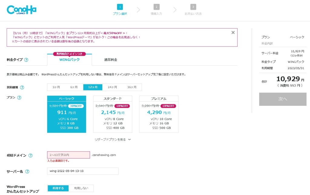 まずは、プランを選択します。「ベーシック」「スタンダード」「プレミアム」から選択できます。他にもいくつかプランがありますが、初めての方は「ベーシック」または、より高速な「スタンダード」あたりがオススメです。