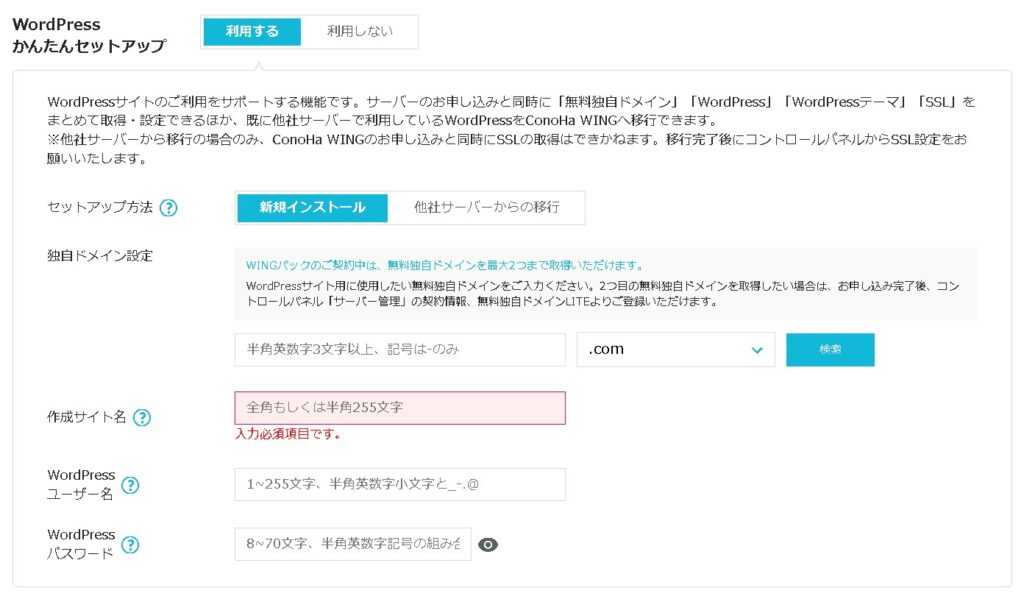 ここからがさらに重要ポイントです。新規で作成するワードプレスのサイト情報を入力していきます。