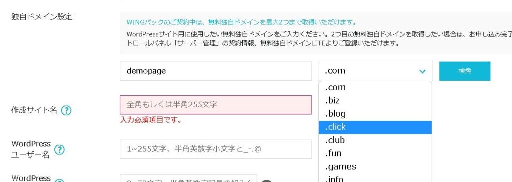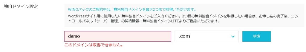 「独自ドメイン」を取得します。左側に使用したいドメインを入力して「検索」します。すでに取得されているドメインの場合は「このドメインは取得できません。」と表示されます。
