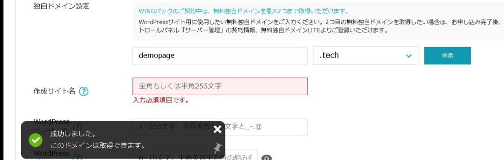 取得できる場合は、検索を押すと「成功しました。このドメインは取得できます。」と表示されます。