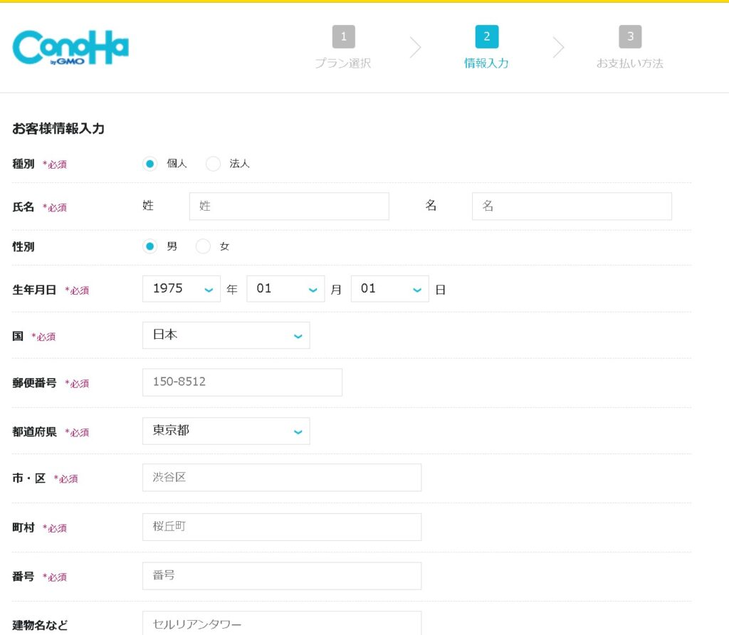 画面にそって個人情報を入力していきます。もし法人で申し込む場合は、法人の方に切り替えます。
