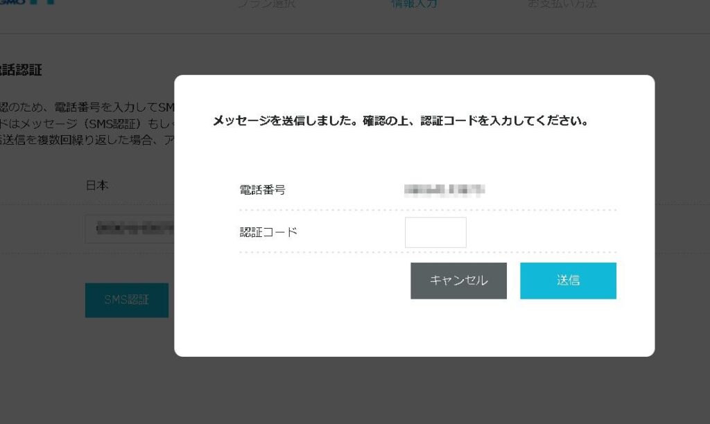 SMS認証を押すとショートメッセージで認証コードが届きますので、入力して送信を押します。