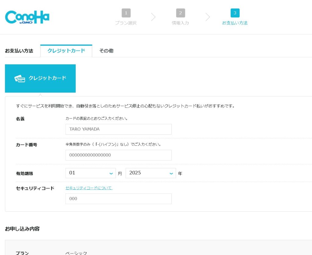 お支払い方法を入力する画面になります。お支払い方法はいくつか選べるようになっていますが、クレジットカードがオススメです。