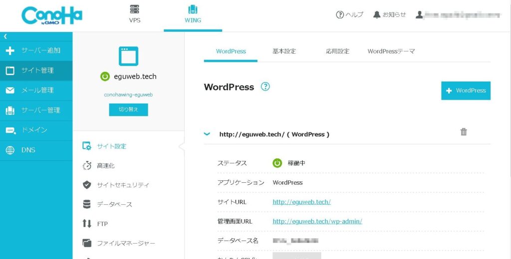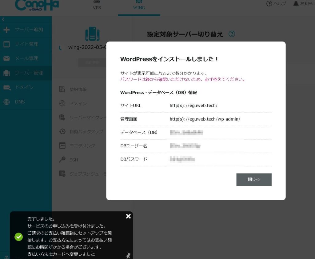 ConoHaのコントロールパネル(管理画面)が表示されて、同時に「WordPressをインストールしました!」と表示されます。