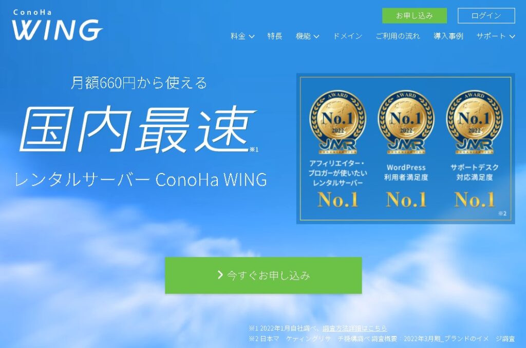 ConoHa WINGは、ドメイン・メールアドレス無制限、無料独自SSL、無料Webフォント、WPかんたん移行ツール標準提供、サーバー、ドメイン、テーマがパックになったWordPressかんたんセットアップ機能が搭載されている「国内最速レンタルサーバー・簡単WordPressサイト開設サーバー」です。