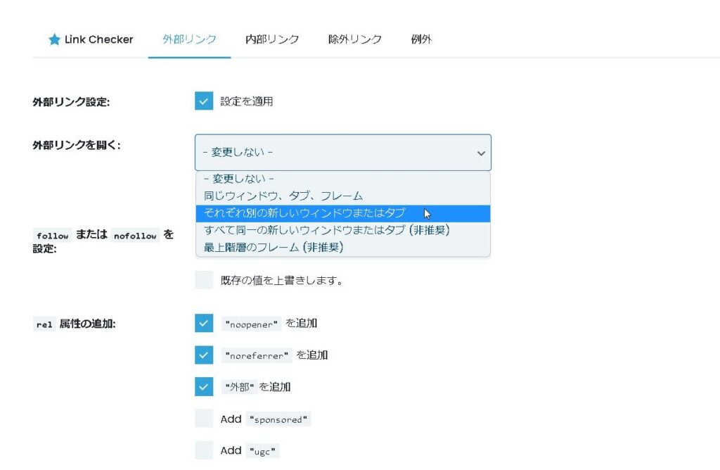 サイト上のすべての外部リンクと内部リンクを管理します。コントロールアイコン、nofollow、noopener、ugc(ユーザー生成コンテンツ)、スポンサー、およびリンクが新しいウィンドウまたは新しいタブで開くかどうか。