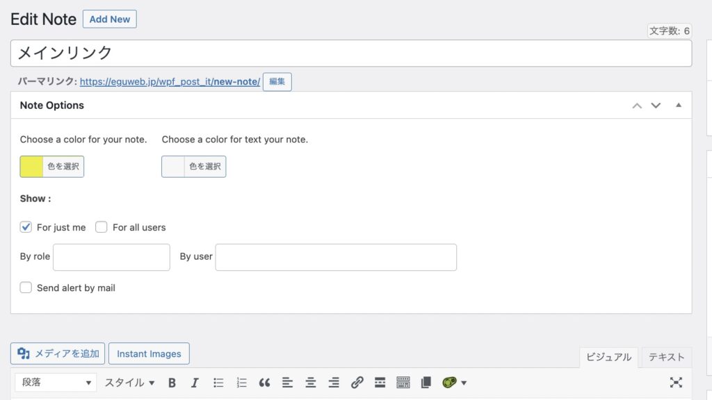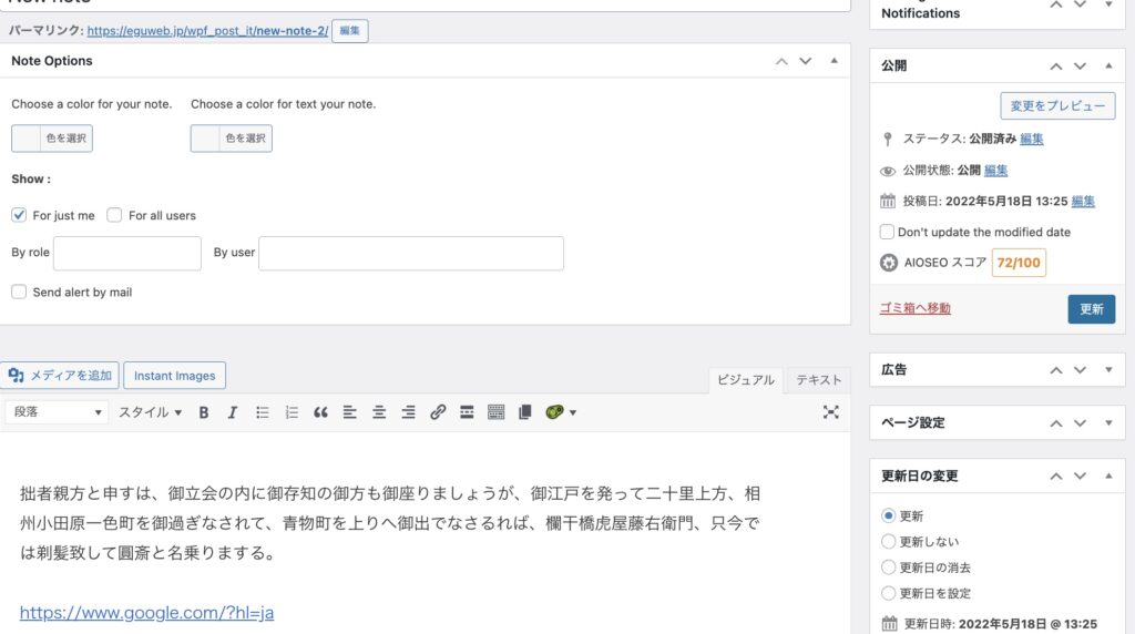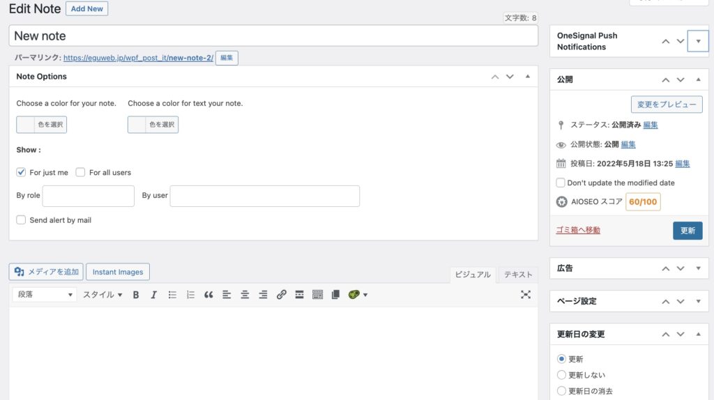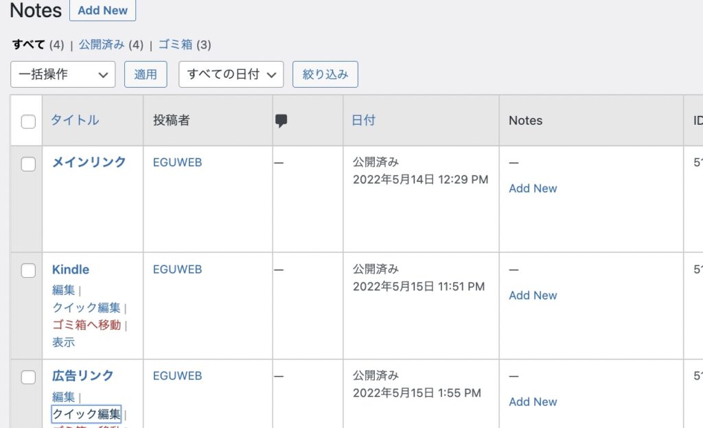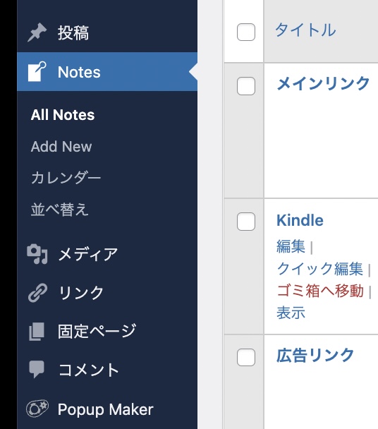 ちなみに、新規追加したい場合は、管理画面左側のメニューにNotesという画面が追加されていますので、こちらから通常の投稿と同じように扱うことができます。