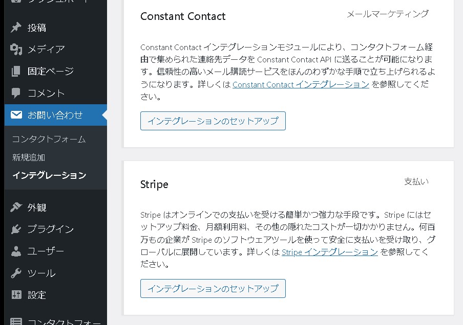 中に「Stripe」というメニューがあるので「インテグレーションのセットアップ」をクリックします。