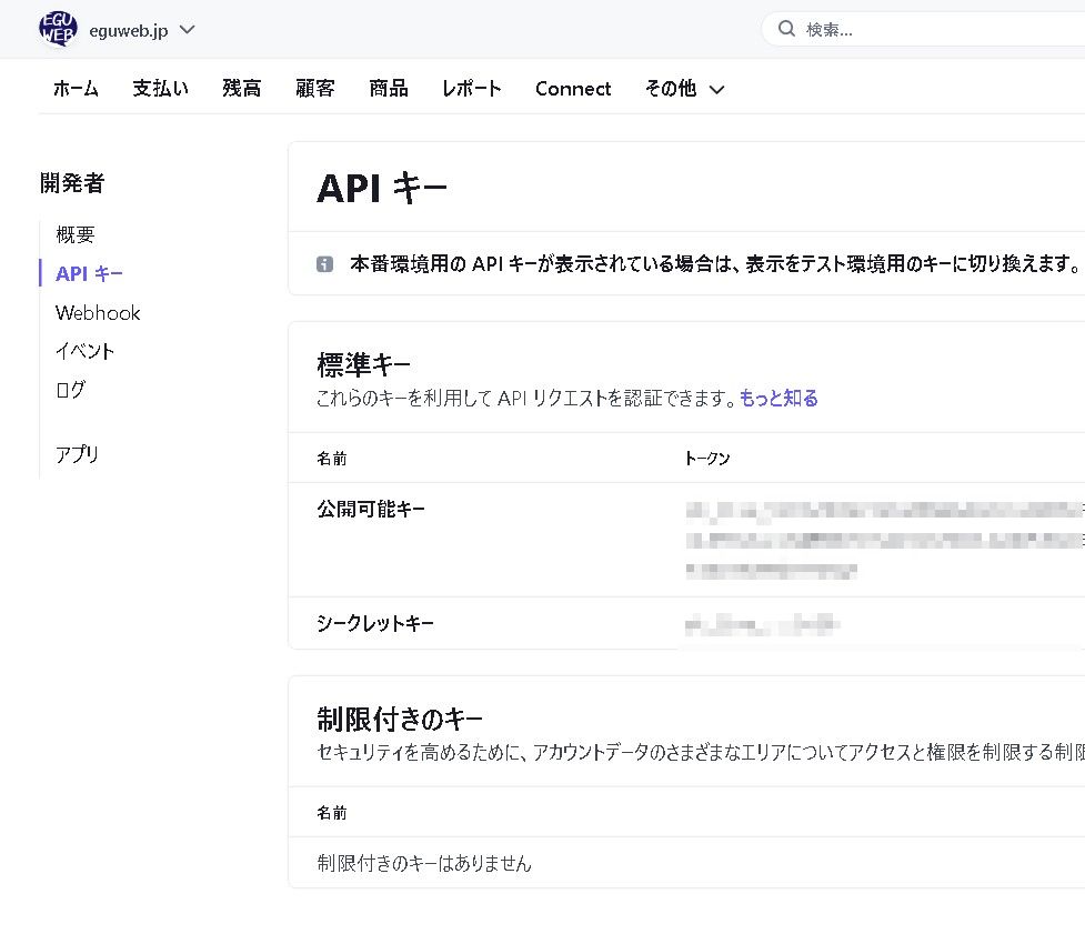 Stripeの「開発者」メニュー内に「APIキー」という場所があります。