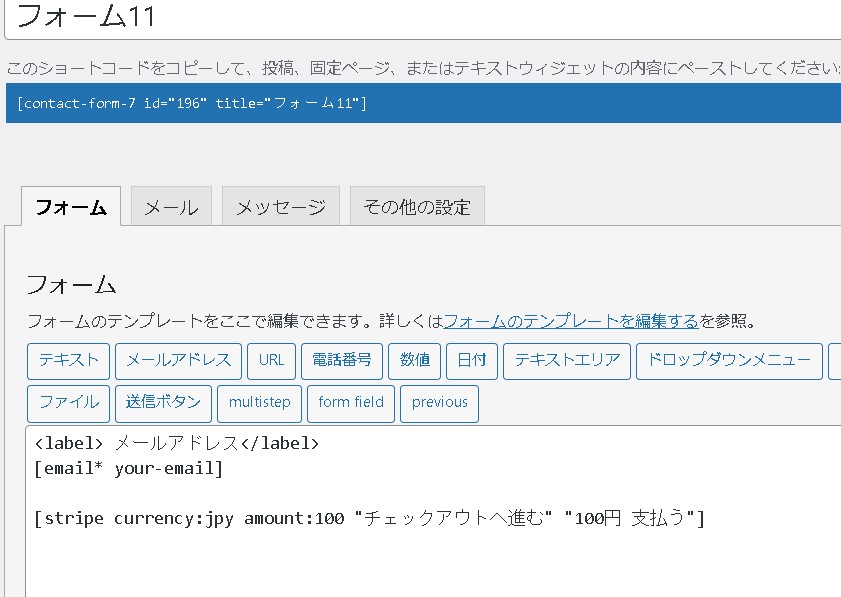 あとは、Contact Form 7のフォーム内に、支払い用のタグを設定すれば決済ができるようになります。