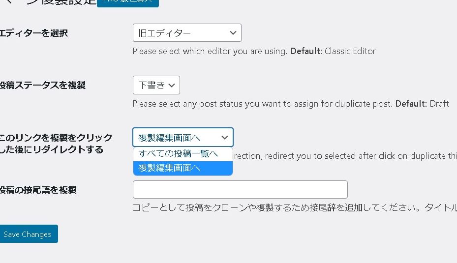 複製と同時に編集画面を開く設定もあります。「このリンクを複製をクリックした後にリダイレクトする」の選択を「複製編集画面へ」に切り替えると、複製と同時に編集画面を開きます。