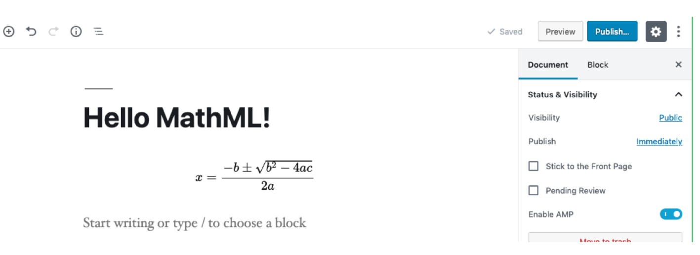 MathML ブロックは、MathJax を使用して、エディターおよび Web サイトのフロント エンドで MathML 式をレンダリングします。MathJax (https://www.mathjax.org/) は、すべてのブラウザーで動作する数学用の JavaScript 表示エンジンです。