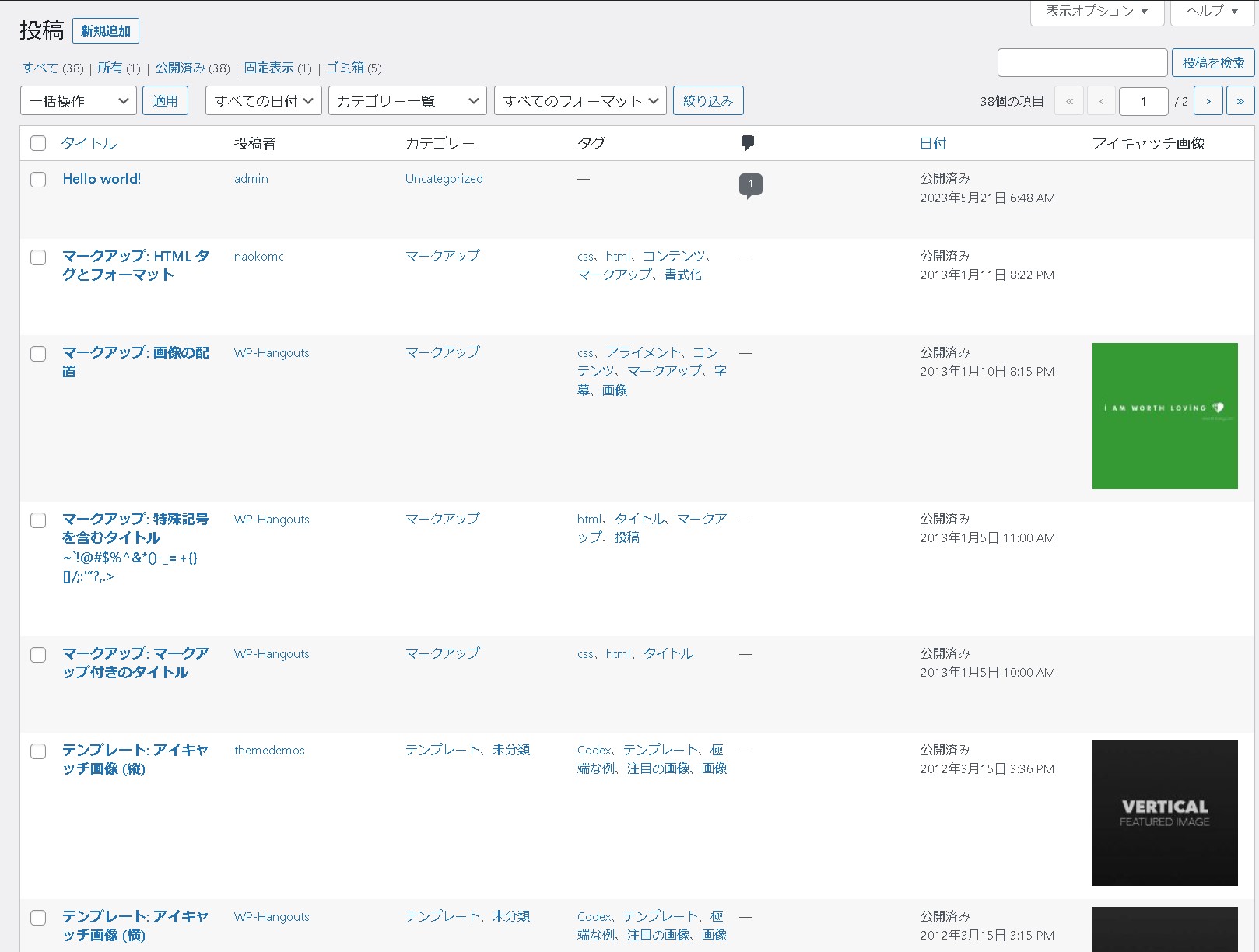 WordPressの投稿一覧にアイキャッチ画像が表示されます。投稿一覧を表示すると、新しく追加した「アイキャッチ画像」という列が表示され、各投稿のアイキャッチ画像がサムネイルとして表示されるはずです。