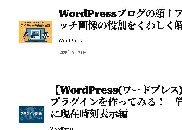 トップページやカテゴリーページ、関連記事などに表示される一覧の中で、アイキャッチ画像があると目立ちやすくなります。