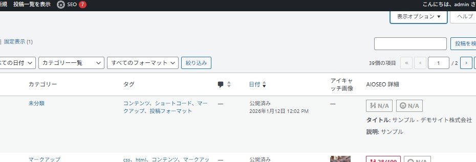 WordPressの投稿一覧では、右上の「表示オプション」から表示する情報を自由に選べます。
