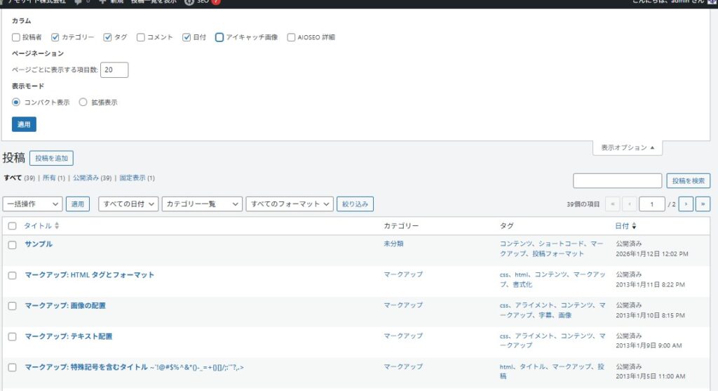 投稿一覧の「表示オプション」で、表示項目(列)が多すぎる
