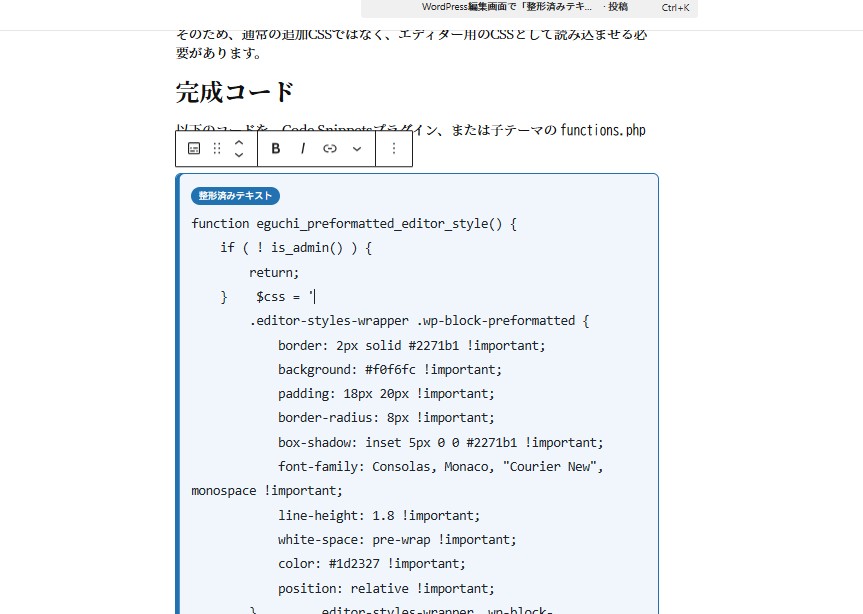 「整形済みテキスト」ブロックが通常の段落と見分けにくい場合は、編集画面専用のCSSを追加するとかなり作業しやすくなります。