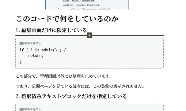 特に、数式・コード・入力例・計算式などを記事内で扱う場合、編集画面上でどこが「整形済みテキスト」なのか分かりにくいと、修正時にかなり不便です。
