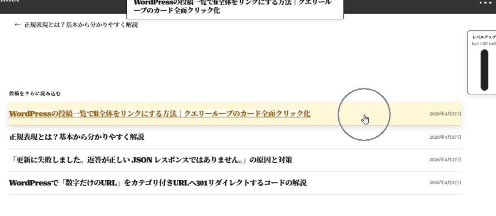 今回の方法では、タイトルリンクをli全体に広げるため、投稿日部分をクリックしてもタイトルリンク側のURLが優先される可能性があります。