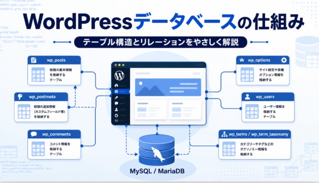 この記事では、WordPressのデータベース構造を初心者にもわかるように、主要テーブルの役割やテーブル同士のつながりを丁寧に解説します。